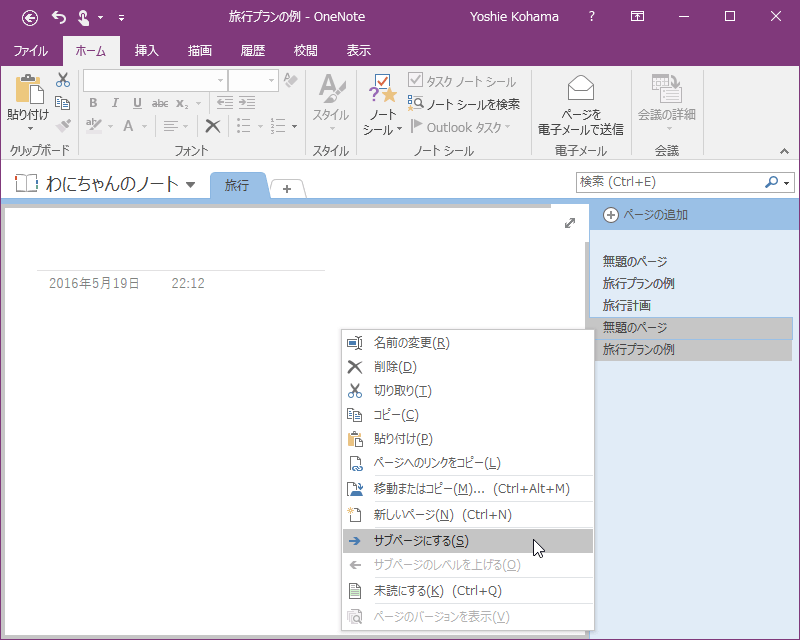 - 右クリックしてショートカットメニューより[サブページにする]を選択します。