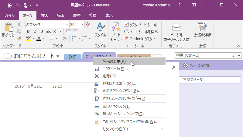 名前を変更したいセクションを右クリックして、ショートカットメニューより[名前の変更]を選択します。セクションをダブルクリックしてもOKです。