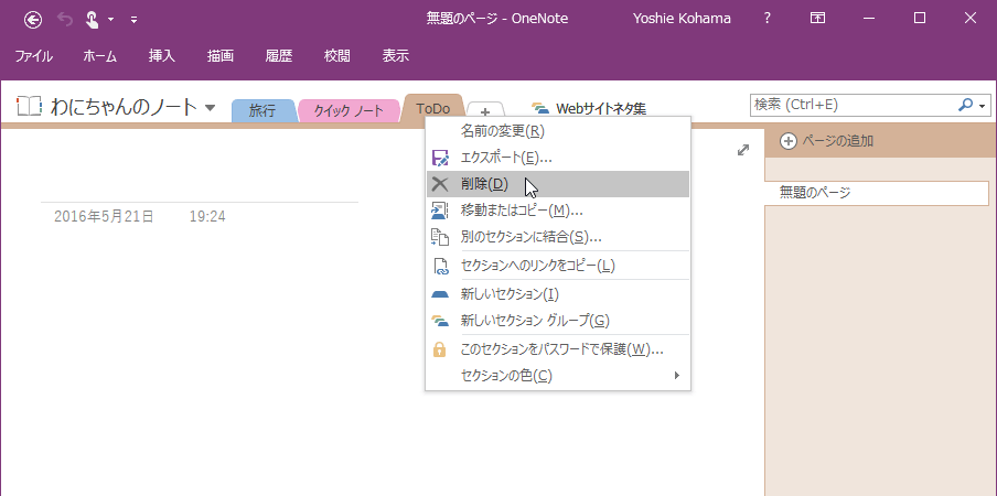 削除したいセクションを右クリックして、ショートカットメニューより[削除]をクリックするか、削除したいセクションを選択して[ホーム]タブの[削除]をクリックします。削除されたセクションは削除済みノートに移動され、60日間保持されます。