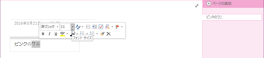 文字を選択するとミニツールバーが表示されるので、そのミニツールバーの[フォントサイズ]ボックスからフォントサイズを選択することも可能です。