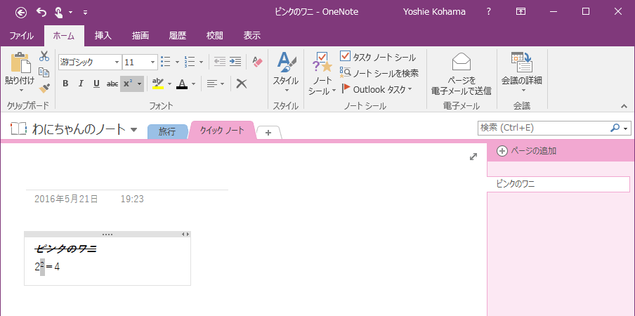 テキスト行の下部や上部に小さな文字を配置するには、対象となる文字を選択して[ホーム]タブの[上付き/下付き文字]ボタンの▼をクリックし、[下付き (Ctrl+;)]や[上付き (Ctrl+Shift+;)]を選択します。