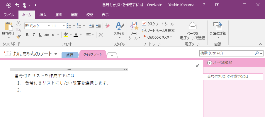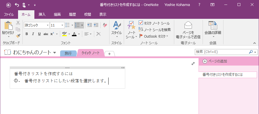 - 番号付きリストにしたい段落を選択します。まだ1項目しかない場合は、カーソルを移動した状態でもOKです。