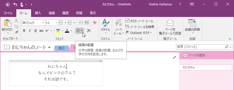- 基準となる段落内にカーソルを移動して[ホーム]タブの[段落]グループにある[段落の配置]ボタンをクリックします。