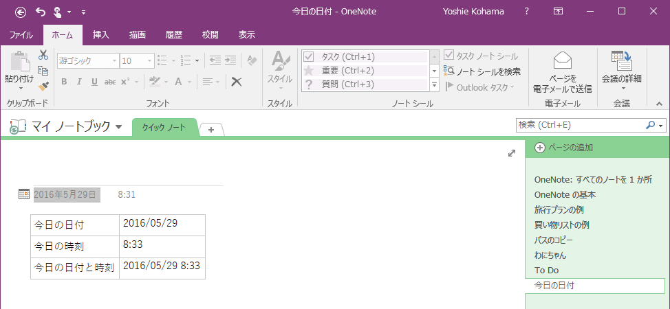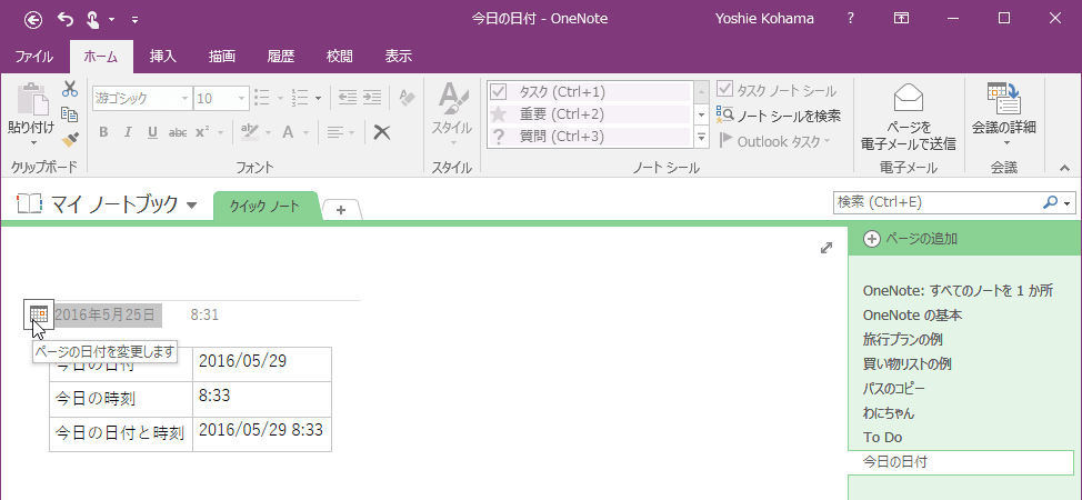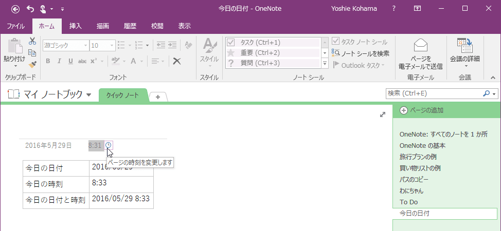 ページの日付と時刻は、ページが作成されたシステムの時刻が挿入されます。この日付と時刻を後で変更するには、ページタイトル下の日付や時刻をクリックして、変更したい時間を指定します。