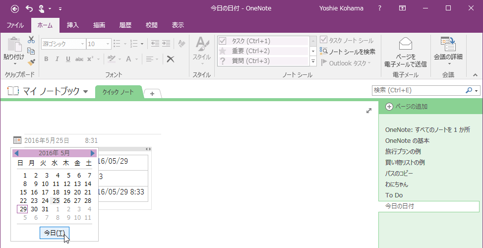 - 変更したい日付を選択します。今日にするには[今日]ボタンをクリックします。