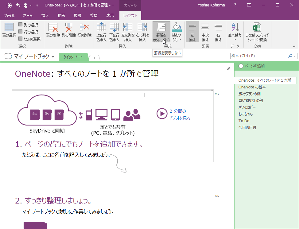 表をレイアウト枠代わりに利用する場合、罫線を非表示にするとよいでしょう。[表ツール]の[レイアウト]タブを開き、[書式]グループの[罫線を表示しない]をクリックします。もう一度クリックすると罫線が再表示されます。