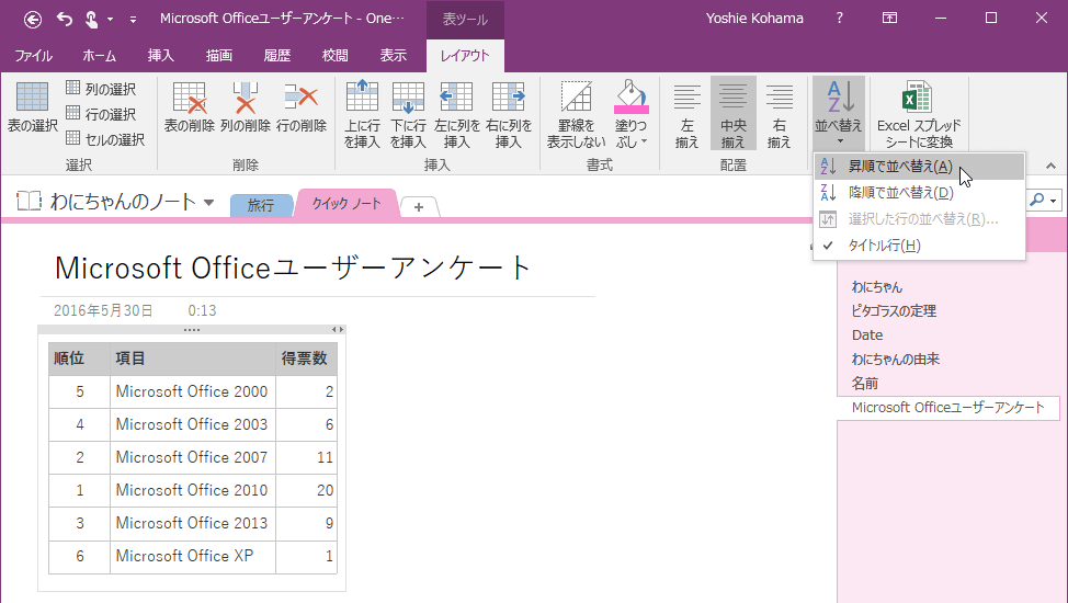 - [表ツール]の[レイアウト]タブを開き、[並べ替え]をクリックします。