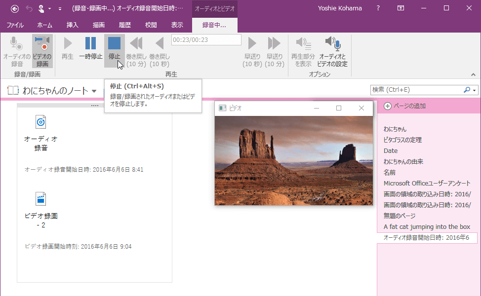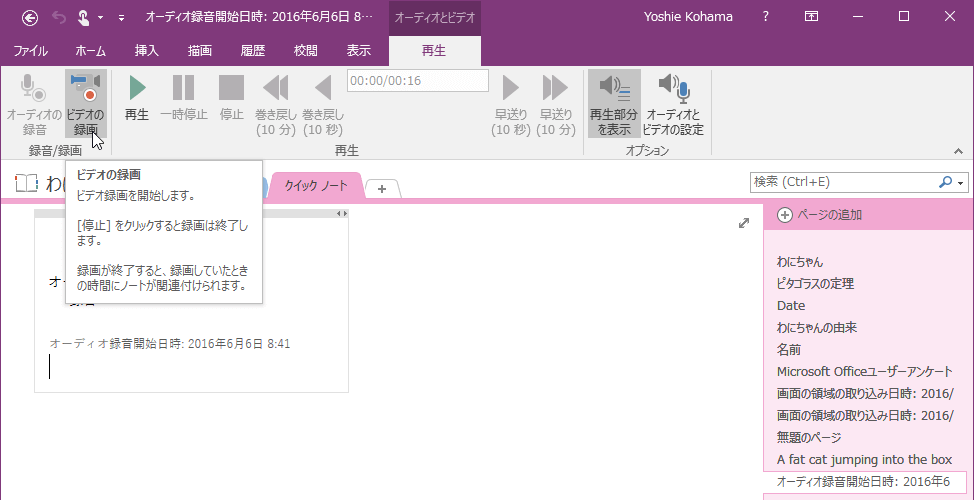 コンピュータにWebカメラが搭載されている場合は、ビデオ録画を開始することができます。[挿入]ボタンをクリックし、[録音/録画]グループの[ビデオの録画]をクリックします。[停止]をクリックすると録画は終了します。録画が終了すると、録画開始時間にノートが関連付けられます。