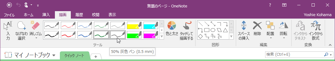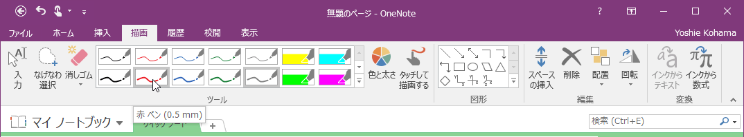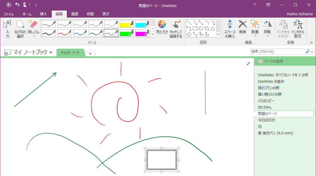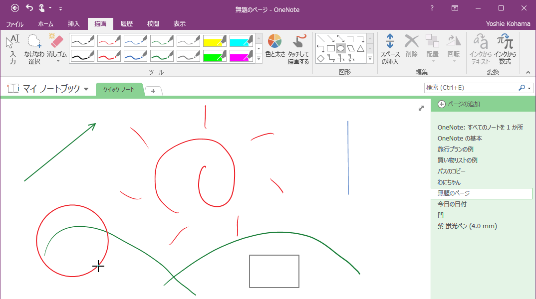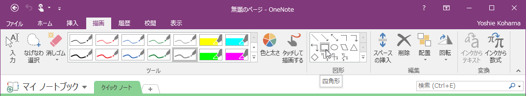 [描画]タブの[図形]グループには四角形や円などの図形が用意され、選択してドラッグすることで図形を描くことができます。まず、線の色と太さを選択し、[図形]グループから描きたい図形の種類を選択して、対角線上にドラッグします。正方形や正円を描くには、Shiftキーを押しながらドラッグするとOKです。