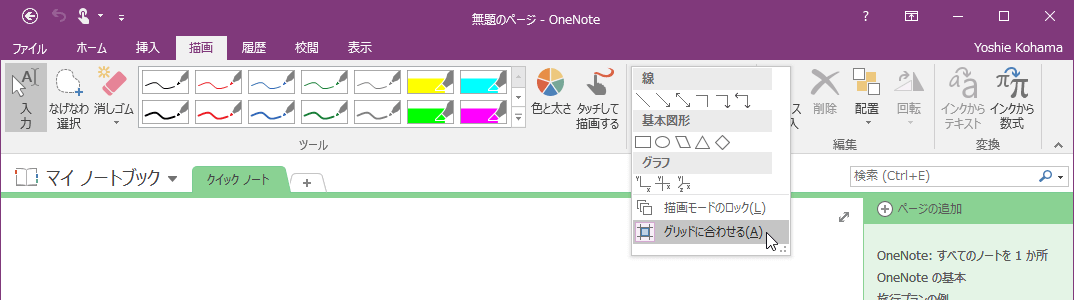 図形をグリッドに合わせて描画することで、統一サイズの図形を描くことができます。[描画]タブの[図形]ギャラリーの[その他]をクリックして、[グリッドに合わせる]を選択します。