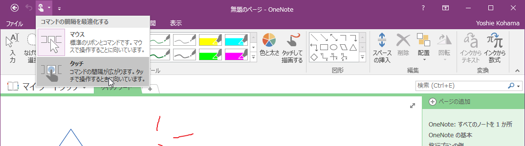 Surfaceなどにおいて、ペンじゃなくて、すべて指で操作したいという場合、[タッチして描画する]コマンドを有効にするとOKです。