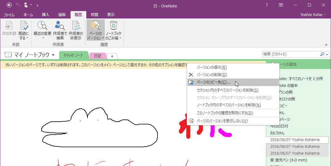 古いバージョンをメインページとして復元するほかに、別のセクションにコピーすることも可能です。古いバージョンを表示し、情報バーをクリックして、[ページのコピー先]を選択し、コピー先のセクションを選択します。