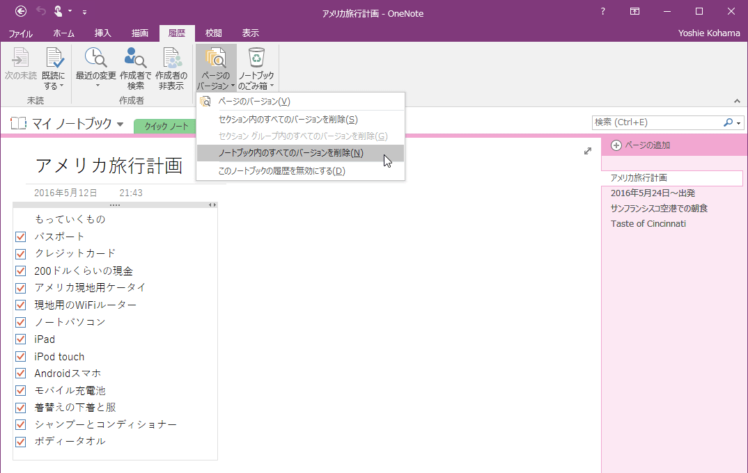 現在のセクションに限らず、ノートブック内のすべてのバージョンを削除するには、[履歴]タブの[ページのバージョン]の▼をクリックして、[ノートブック内のすべてのバージョンを削除]を選択します。この操作は元に戻せないので、念のためすべてのページの古いバージョンを確認、残したいバージョンは別のセクションにコピーまたは復元等の操作を済ませてから行ってください。