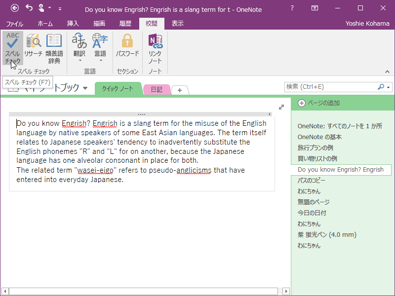 - [校閲]タブを開き、[スペルチェック]をクリックするか、F7キーを押します。