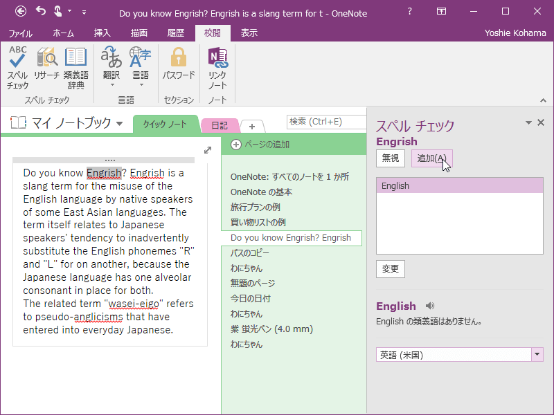 - [スペルチェック]作業ウィンドウが開いたら、[追加]ボタンをクリックします。