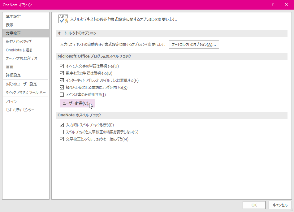 - [OneNoteオプション]ダイアログボックスの[文章校正]タブを開きます。