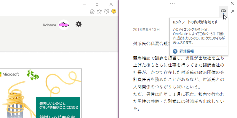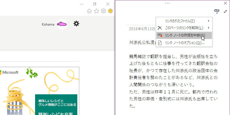 ドッキングウィンドウのリンクノートの有効/無効のアイコンをクリックして、リンクノートの作成を中断できます。もう一度そのアイコンをクリックして、[リンクノートの作成を開始]を選択すると、リンクノートの作成が再開されます。