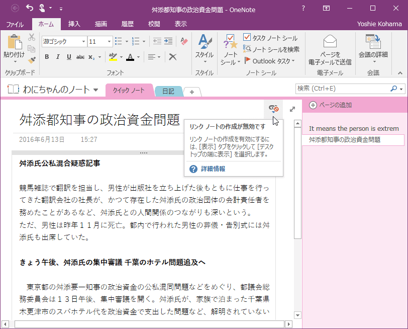 リンクノートの右上の有効/無効のアイコンをクリックして、一覧から[このページのリンクを解除]を選択し、解除したいリンクを選択します。[このページのすべてのリンクを解除]を選択すると、すべてのリンクが解除されて通常のノートになります。