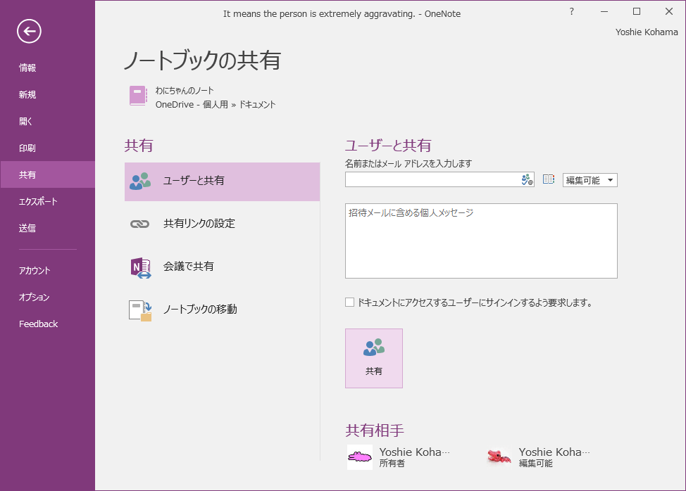 Microsoftアカウントを使っている他のユーザーを招待するには、[ファイル]タブを開き、[情報]ウィンドウの共有したいノートブックの[他のユーザーをこのノートブックに招待します]をクリックして、宛先の電子メールアドレス、メッセージを入力して[共有]ボタンをクリックします。