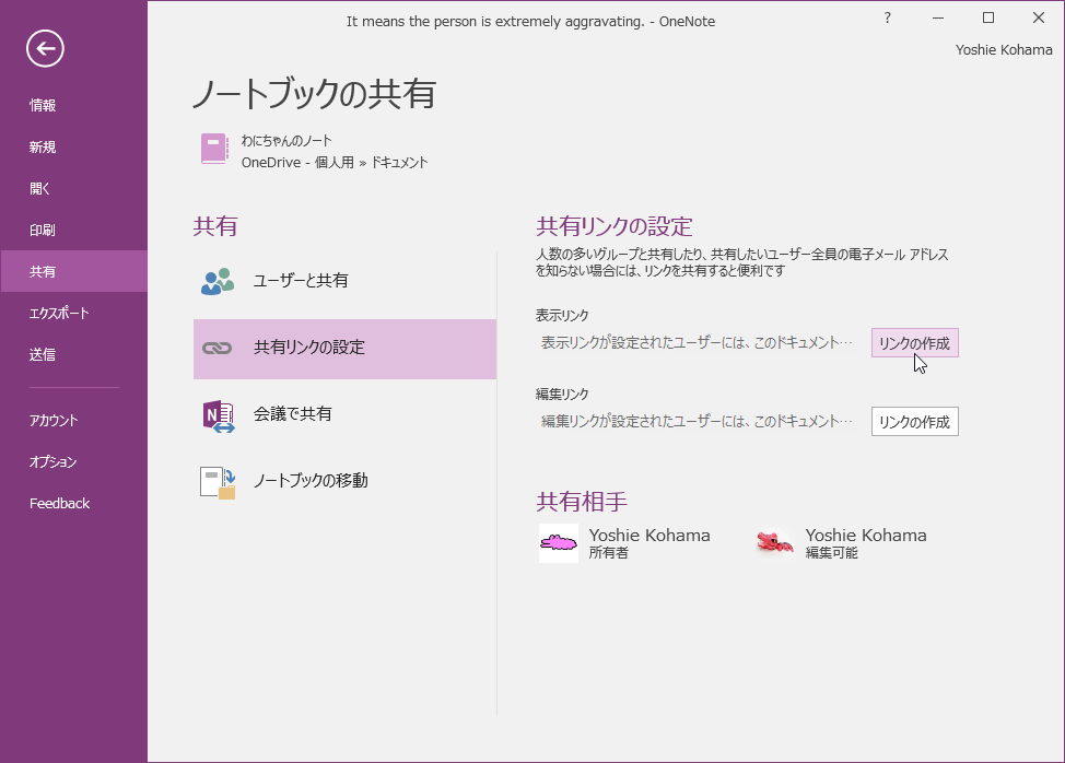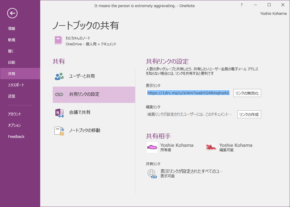 電子メールアドレスが不明な場合、あるいは、不特定多数の人たちにノートブックを見せたい場合、ノートブックの表示リンクを作成するとOKです。表示リンクは編集は許可されず、閲覧のみとなります。