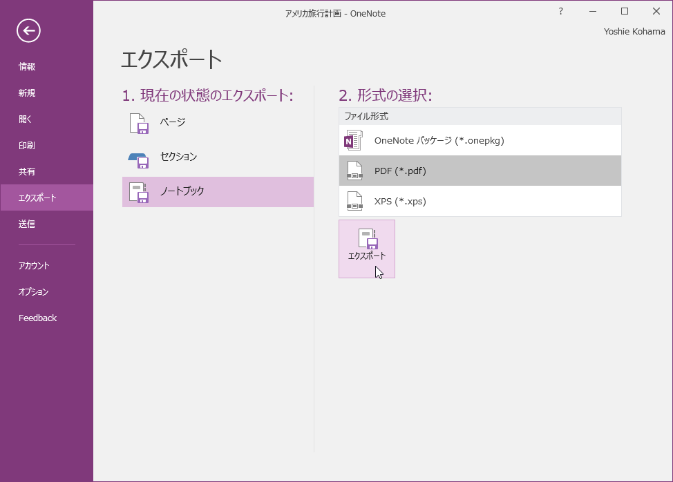 対象となるノートブックを表示して[ファイル]タブを開き、[エクスポート]を選択して、エクスポート対象を[ノートブック]、ファイル形式一覧より[PDF]を選択して[エクスポート]ボタンをクリックします。エクスポートされたPDFでは、ページごと、セクションごとに改ページされます。