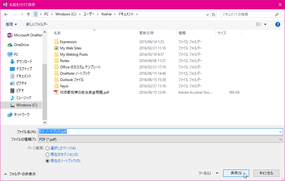 - [名前を付けて保存]ダイアログボックスで、[ページ範囲]オプションでは[現在のノートブック]が選択されていることを確認します。