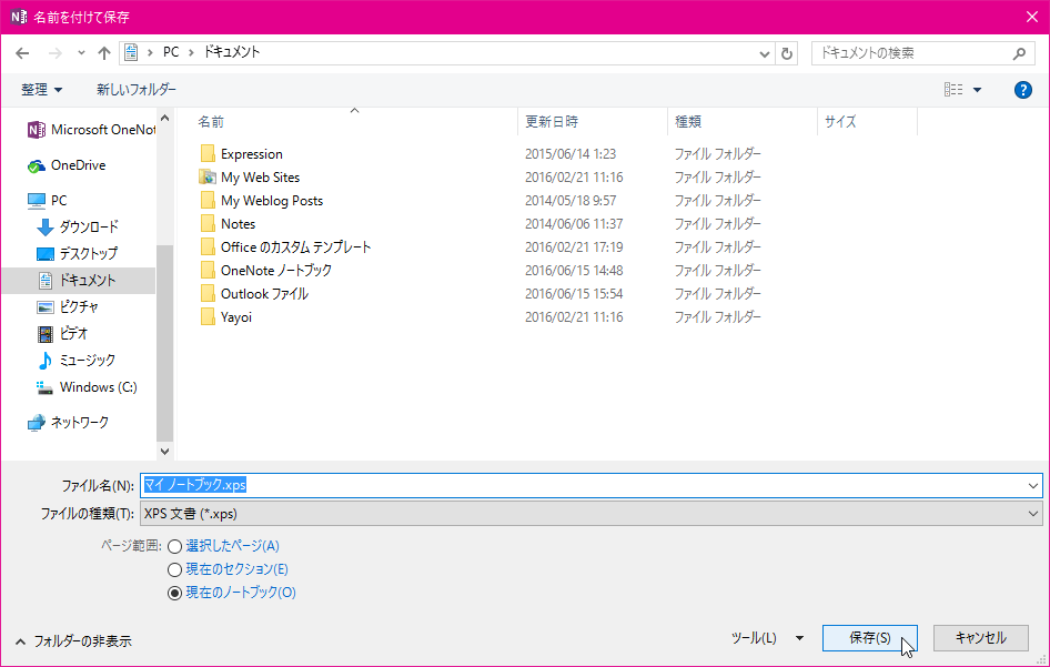 - [名前を付けて保存]ダイアログボックスで、[ページ範囲]オプションでは[現在のノートブック]が選択されていることを確認します。