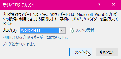 - [新しいブログアカウント]ダイアログボックスで[ブログ]の一覧から「WordPress」を選択して[次へ]ボタンをクリックします。