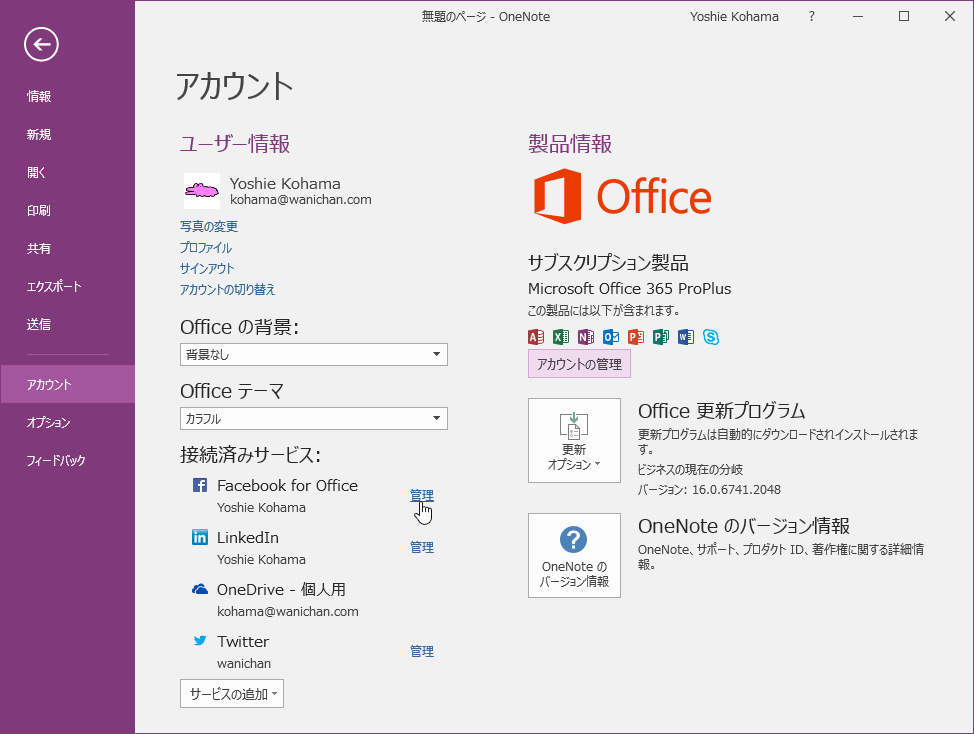 - [ファイル]タブを開き、[アカウント]タブを開いて、[接続済みサービス]一覧から[Facebook for Office]の[管理]をクリックします。