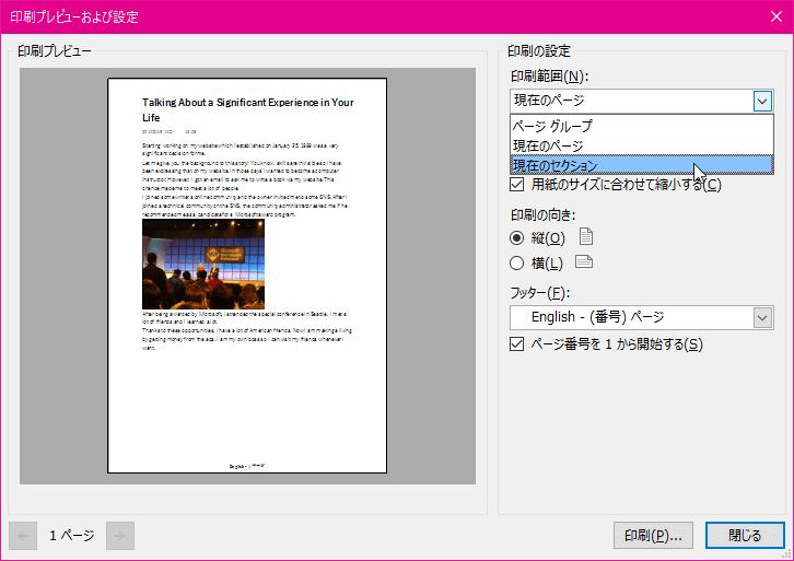 - [印刷プレビューおよび設定]ダイアログボックスが開いたら、[印刷範囲]ボックス一覧から[現在のセクション]を選択します。
