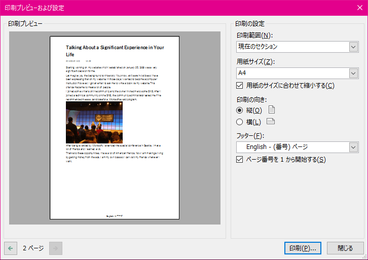 既定の印刷範囲は「現在のページ」ですが、「ページグループ」や「選択されたページ」、「現在のセクション」を選択することができます。[印刷プレビューおよび設定]ダイアログボックスで[印刷範囲]ボックスにて印刷範囲を指定します。