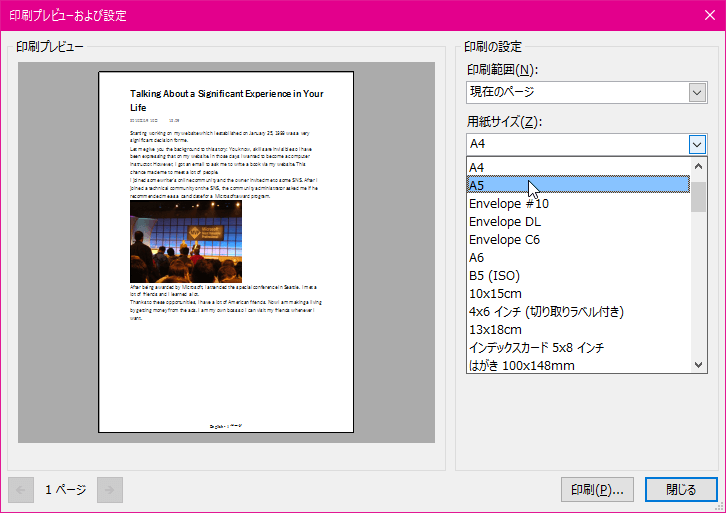 - [印刷プレビューおよび設定]ダイアログボックスが開いたら、[用紙サイズ]ボックス一覧から用紙サイズを選択します。