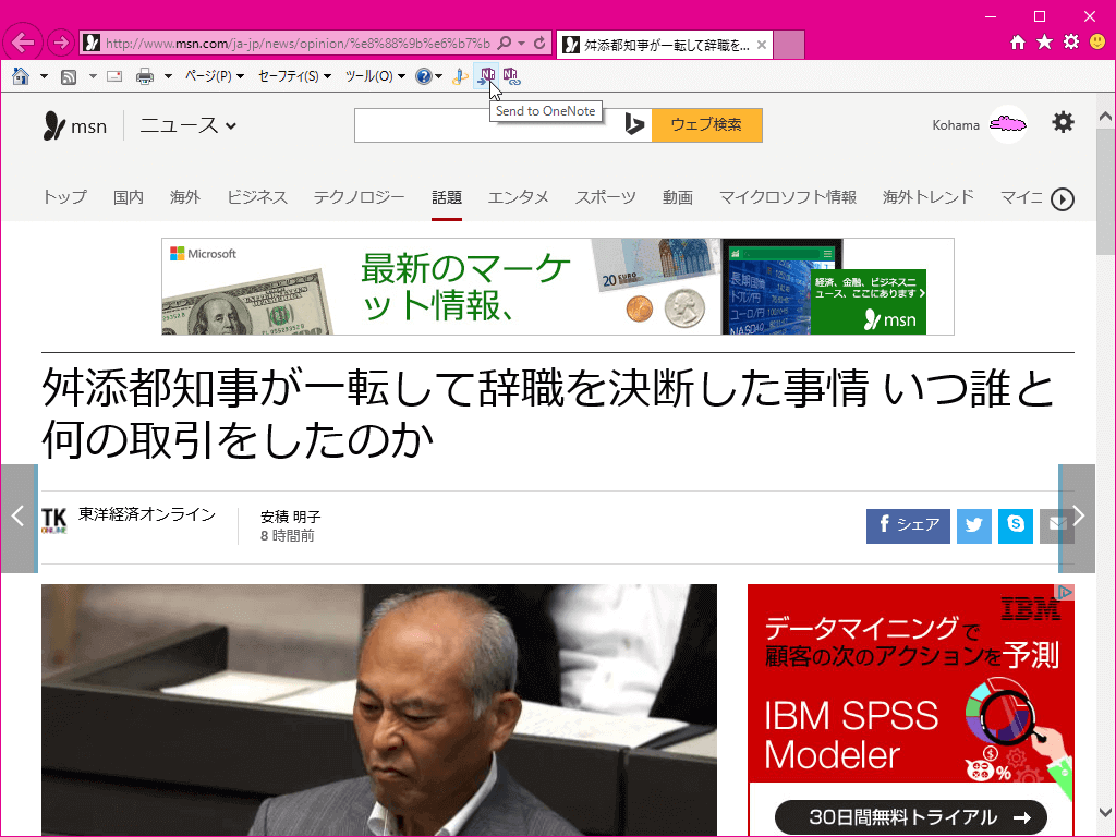 Internet Explorer 11でOneNoteに送るWebページを表示して、コマンドバーの[Send to OneNote]をクリックし、[OneNoteの場所の選択]ダイアログボックスが表示されたら、Webノートを保存するセクションを選択します。MSNニュースの場合、不要なタグなどが挿入されるので、あとから削除するとOKです。