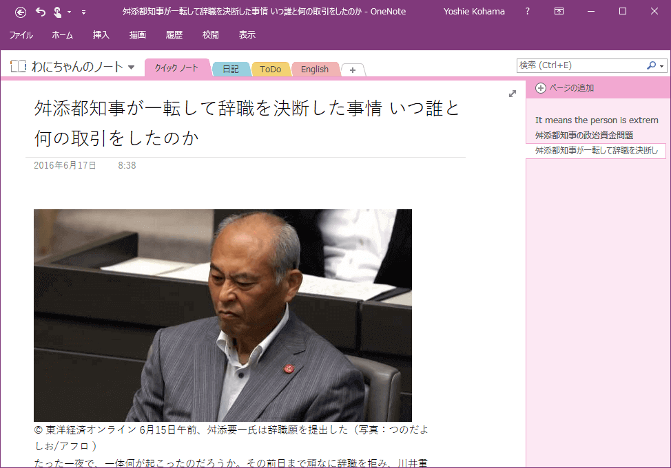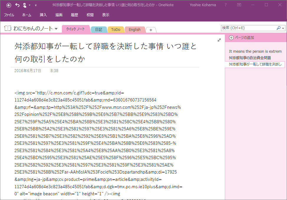 - OneNote 2016を起動して、送信先のセクションを開き、送信されたWebノートを表示します。