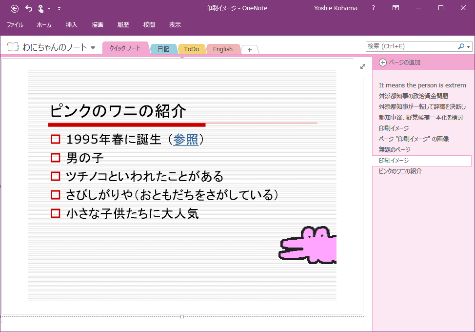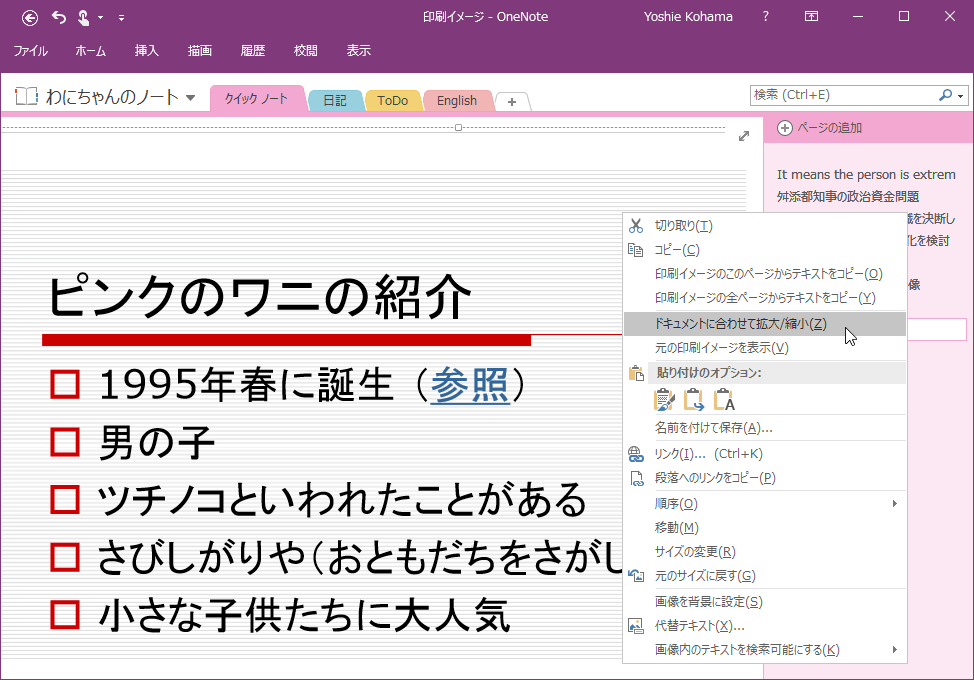OneNote 2016でページからはみ出たオブジェクトを全体的に表示したい場合や、小さく縮小されているオブジェクトをドキュメントに合わせて全体的に拡大するには、右クリックしてショートカットメニューより[ドキュメントに合わせて拡大/縮小]をクリックします。
