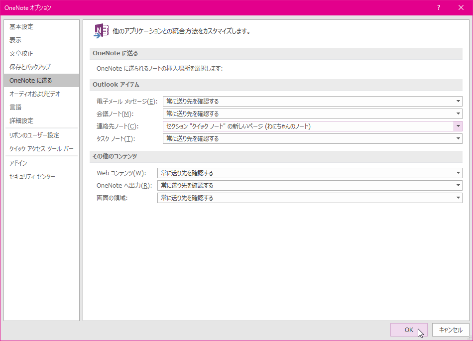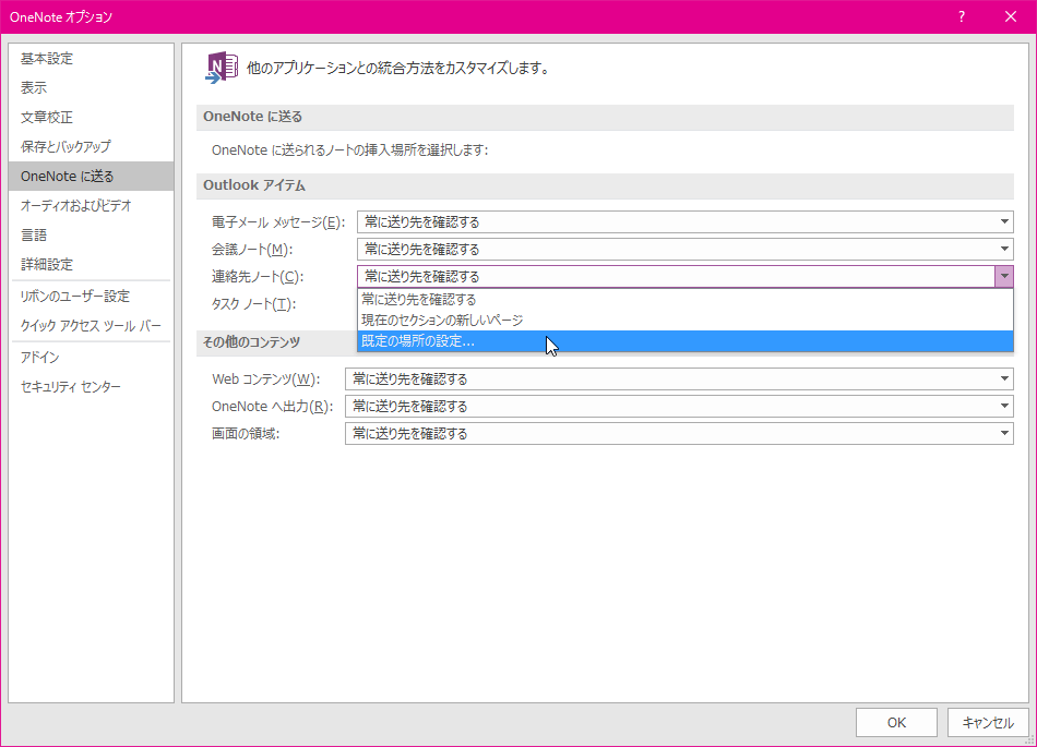 既定では、連絡先ノートの送り先は毎回確認する画面が表示されます。もし、その送り先を固定したい場合、[OneNoteオプション]ダイアログボックスの[OneNoteに送る]タブを開き、[Outlookアイテム]の[連絡先ノート]ボックス一覧から選択します。