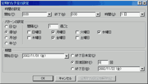 すると、パターン:「月曜日/水曜日/金曜日。2002/11/01 から 2002/11/13 まで有効」と表示されました。