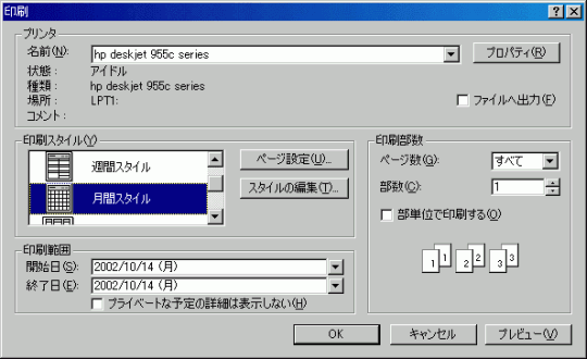今月の予定の印刷方法、および、印刷スタイルやオプションの設定方法について説明します。