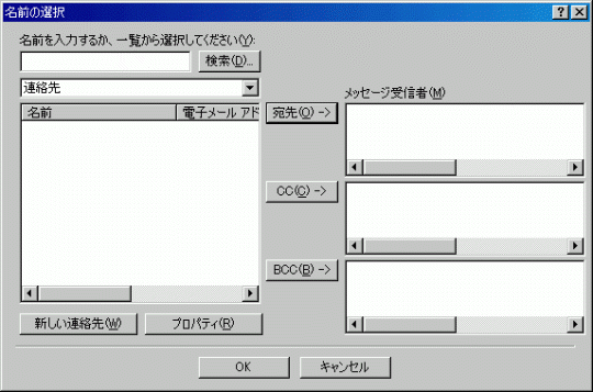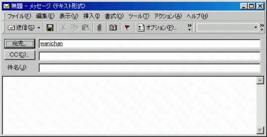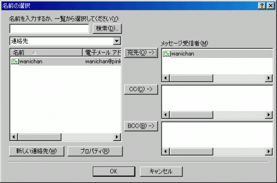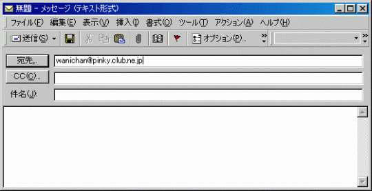 次に、相手側のE-mailアドレスを入力します。例えば私のE-mailアドレス、wanichan@pinky.club.ne.jp と入力してみます(注:このメールアドレスは現在使っていません)。