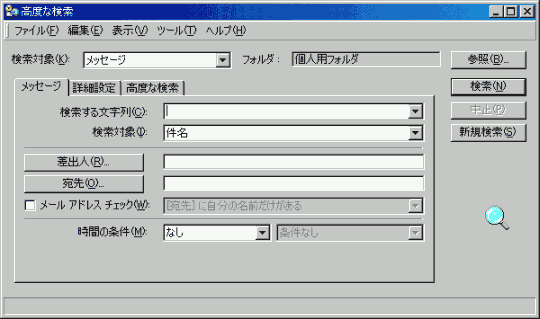 メッセージタブ内では、どの検索対象で検索するか、または特定の差出人、宛先を指定することなどができます。