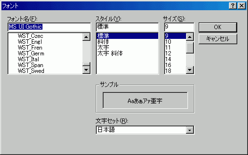 フォントのダイアログボックスが表示されますので、そこでフォント名、スタイル、サイズを指定してOKボタンをクリックします。