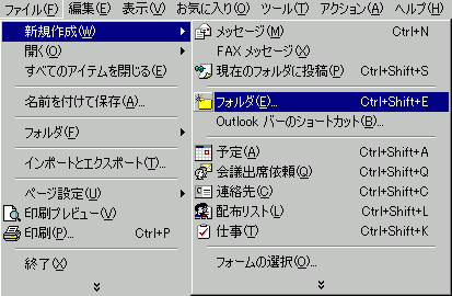 新しいフォルダを作成するには、[ファイル]メニューの[新規作成]をポイントして[フォルダ]をクリック、または、フォルダ一覧の作成したい場所を右クリックしてショートカットメニューより[フォルダの作成]を選択します。