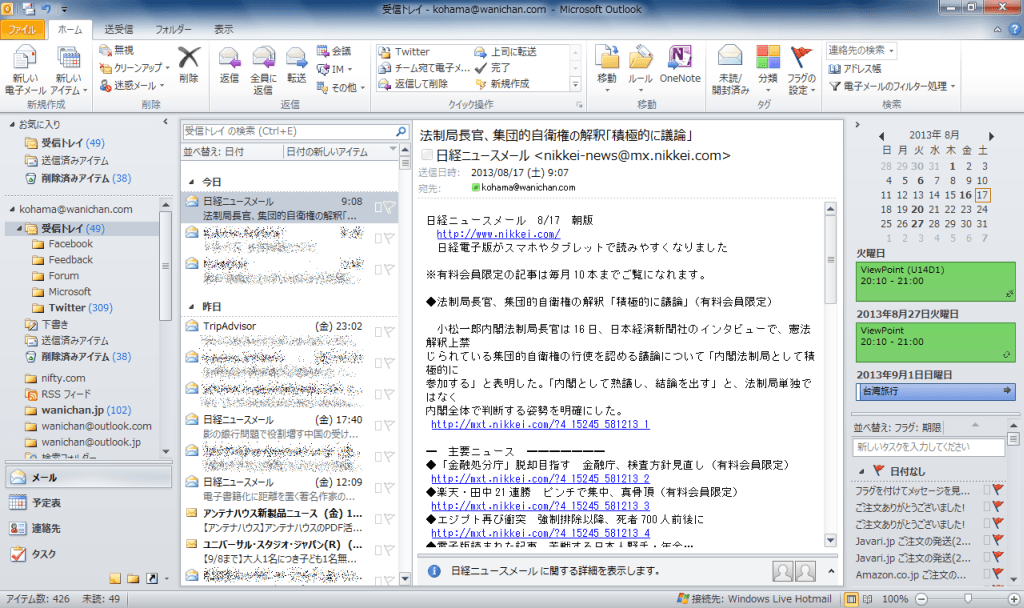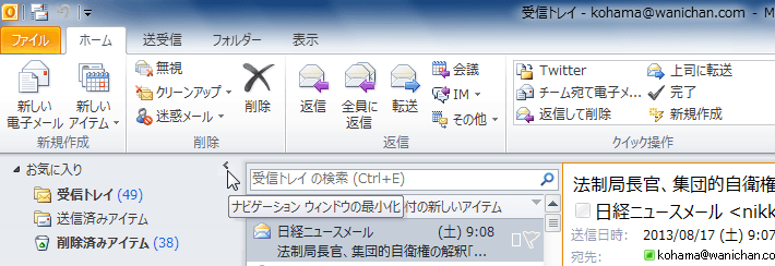 Outlook 2010のナビゲーションウィンドウの右上の[ナビゲーションウィンドウの最小化]をクリックするとナビゲーションが最小化されます。最小化されたナビゲーションウィンドウは[ナビゲーションウィンドウの展開]をクリックすると展開されます。