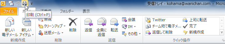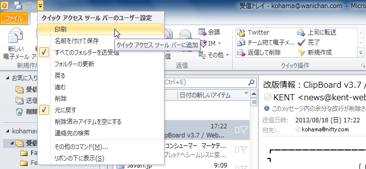 Outlook 2010初期設定では、[すべてのフォルダーを送受信][元に戻す]の2つのボタンが表示されています。この他に、よく使われるコマンドを簡単に追加することができます。[クイックアクセスツールバーのユーザー設定]をクリックして、追加したいコマンドを選択します。