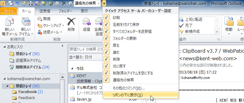 Outlook 2010のクイックアクセスツールバーは既定ではタイトルバーの左側に配置されていますが、リボンの下に移動することもできます。リボンの下に移動することで、クイックアクセスツールバーに追加できるコマンドボタンをたくさん増やせます。