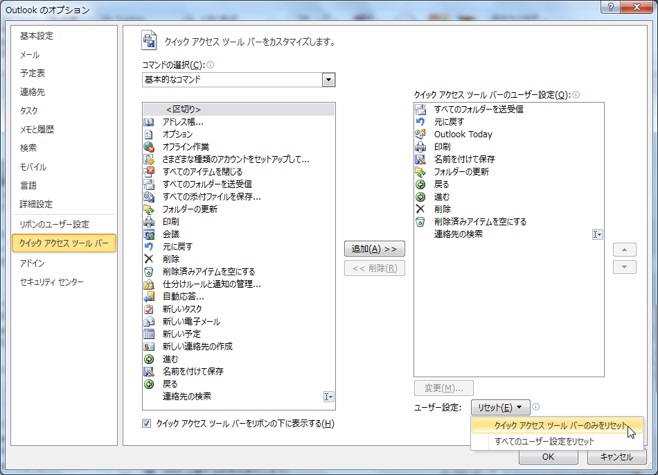 Outlook 2010のクイックアクセスツールバーを既定の設定にリセットするには、[Outlookのオプション]ダイアログボックスの[クイックアクセスツールバー]を開き、[リセット]ボタンをクリックして、[クイックアクセスツールバーのみをリセット]をクリックします。