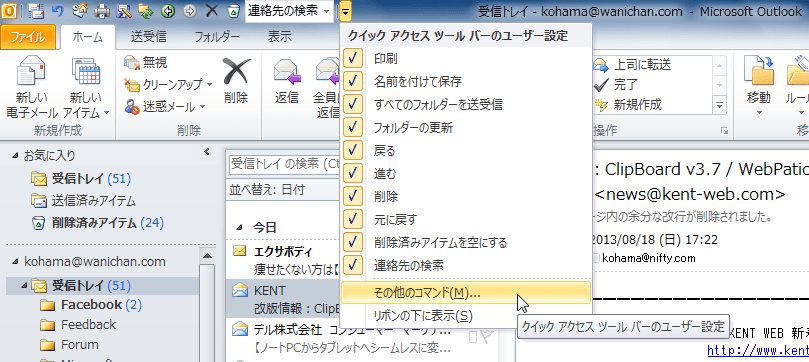 - クイックアクセスツールバーの右側の▼をクリックし、[その他のコマンド]を選択します。