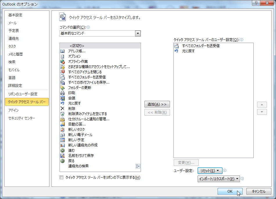 - [Outlookのオプション]ダイアログボックスの[クイックアクセスツールバー]が開かれたら、[リセット]ボタンをクリックします。