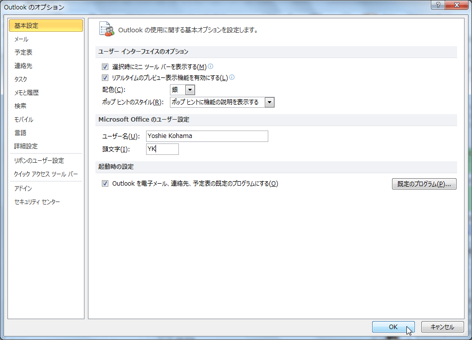 インストール時に設定されたユーザー名と頭文字を変更するには、[Outlookのオプション]ダイアログボックスの[基本設定]にて変更したいものに書き換えるとOKです。