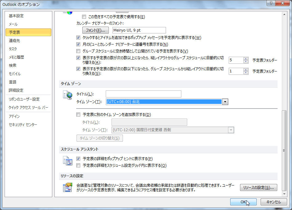 Outlook 2010日本語版の既定では日本のタイムゾーンになります。たとえば台湾へPCを持って行った場合、予定表のタイムゾーンを変更する必要が出てきます。